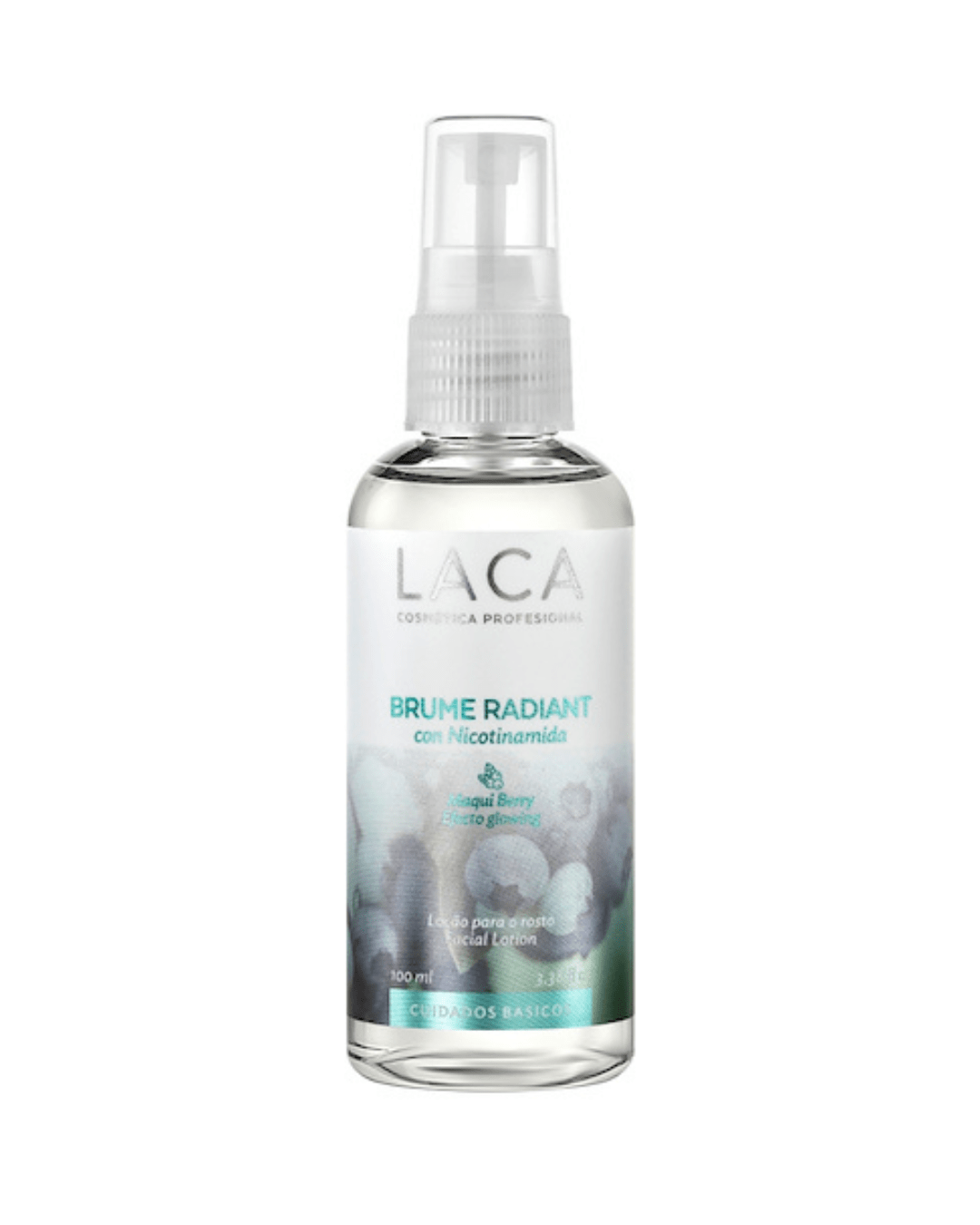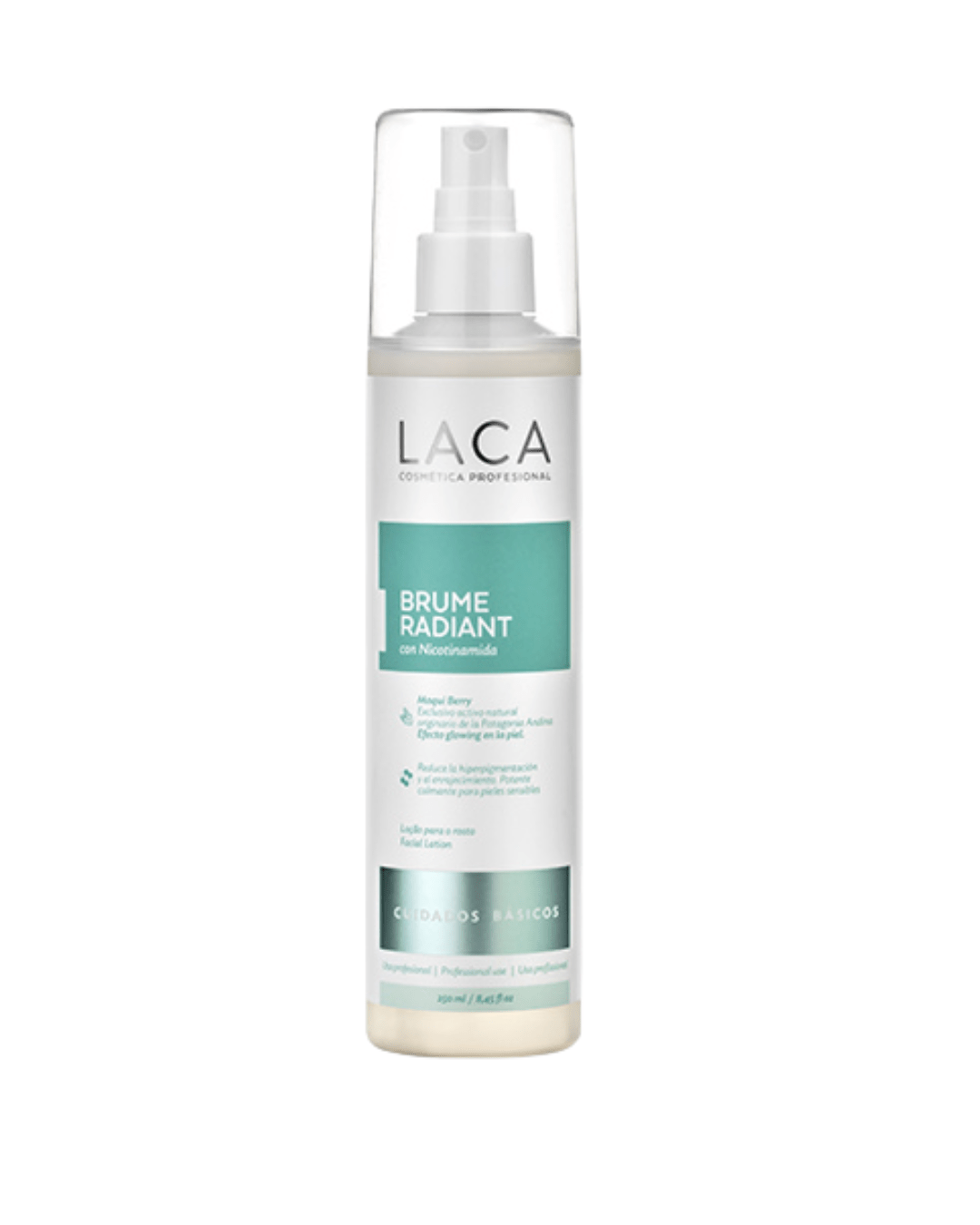 La Brume Radiant de LACA es una bruma facial multifunción que hidrata, suaviza y produce un efecto glowing inmediato en todo tipo de piel gracias a su exclusivo principio activo natural Maqui Berry, originario de la Patagonia Andina. Esta fito fórmula se complementa con Vitamina PP (Niacinamida), que potencia la acción antioxidante y unificadora del Maqui Berry, y con Regaliz, un potente calmante ideal para pieles sensibles.